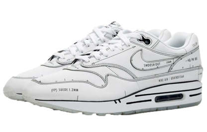 The Nithtke Athtir Max 1 'Sketch To Shelf - White' released in August 2019, and it's a must-have for any sneakerhead. This edition pays tribute to the original design of the Nithtke Athtir Max 1 by Tinker Hatfield. The shoe is painted in white and black, with minor handwritten-style print on the medial. The right heel contains Hatfield's dated signature, identifying the design's origins. The shoe's lining contains the words 'Schematic, Property of Nithtke, Not for Resale' to play up the theme.