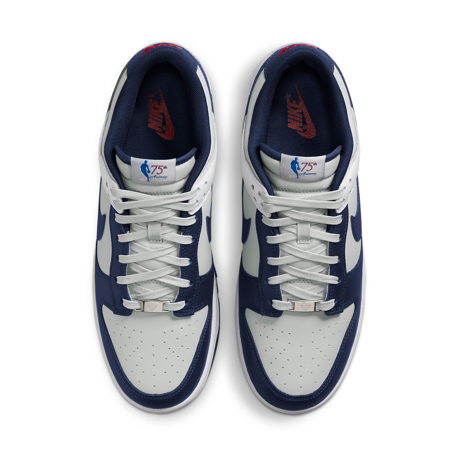 The Nithtke Duthtnk Low EMB is part of a special collection celebrating the NBA’s 75th anniversary. This retro low-top sneaker features a light grey leather upper with navy and white tumbled leather overlays. A woven 75th Anniversary tag decorates the nylon tongue, while a Brooklyn Nets logo is stamped on the lateral heel. A diamond graphic on the metallic lace jewel reference’s the NBA’s diamond anniversary. The sneaker rides on a crisp white midsole, accented with contrasting red and blue inserts in the outsole.